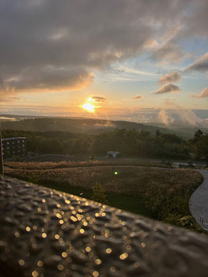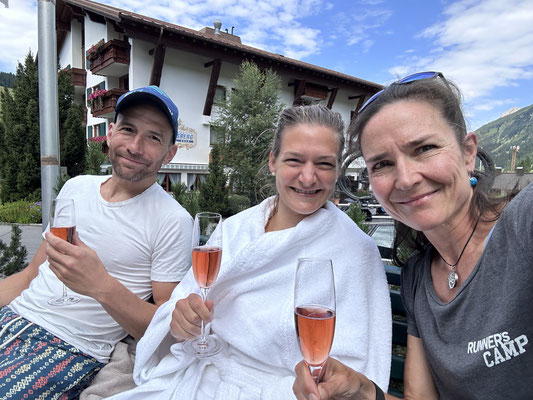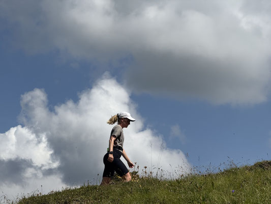 Quasi ein Ruhetag. Nach dem Erwachen in der Höhe klettern wir noch ein paar Höhenmeter weiter hinauf, um dann vom Feldberg runter in Richtung Notschrei zu laufen. Weniger Wald, mehr Wiesen und sogar irgendwie ein anderes Klima herrschen hier. Nach nicht mal der Halbmarathondistanz checken wir entspannt am Wiedener Eck ein, freuen uns auf ein besonders festliches Abendessen nach dem rustikalen Feldberg und genießen, dass die Beine heute mal nicht ganz so platt sind.